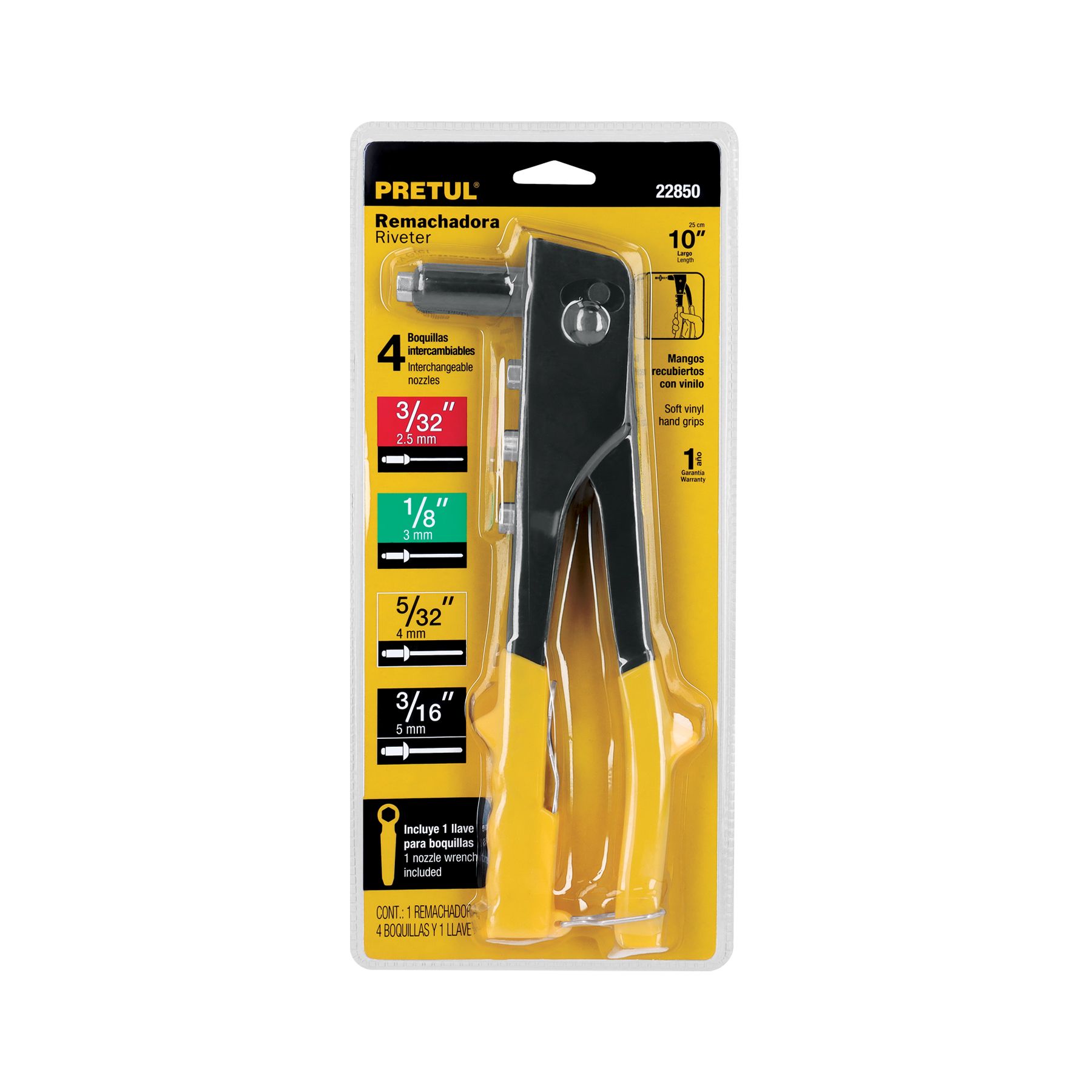 - 4 boquillas de cambio rápido sin necesidad de herramienta para remaches de 3/32″, 1/8″, 5/32″ y 3/16″